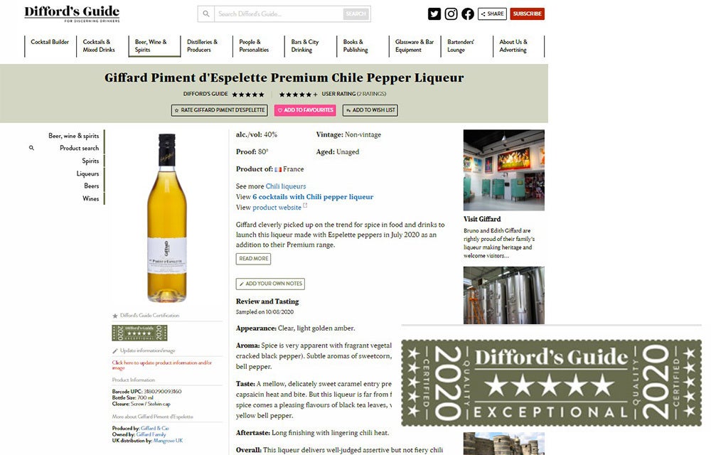 そこで、「ジファール ピモン・デスプレット」は、繊細な甘さとチリの辛味が見事に調和したリキュールとして、2020年、5点満点の高評価を獲得しました。