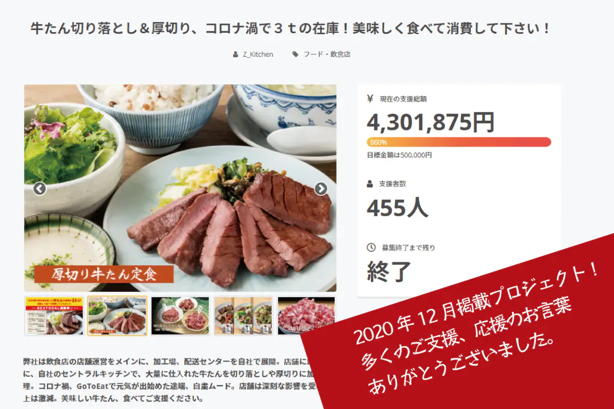 2021/10/28 16:00ご支援者の皆様、いつもありがとうございます。先日、嬉しいことに、Z_Kitchenでクラウドファンディングに公開している別プロジェクトの取材を受けました。(10月30日で終了) 牛たん餃子!コロナ禍で在庫の2tの牛たんを加工食品で、美味しく消費してください。開催期間:2021年9月3日(金)〜2021年10月30日(土)23:59までhttps://camp-fire.jp/projects/view/466885フードロス削減に貢献ということで、SDGsの取り組みをしていると評価され、森商店三宮OPAⅡ店がラジオ番組で取り上げられました。SDGsとは:持続可能な開発目標(SDGs:Sustainable Development Goals)。下記URLをご参照ください。https://www.mofa.go.jp/mofaj/gaiko/oda/sdgs/about/index.htmlサウンドクルーの松田礼那様にご来社頂き、楽しくお話させていただきました。10/26(火)13:45~14:00 (Kiss FM KOBE/Wave!!!!)にて放送していただきました。現在掲載中のプロジェクトは、SDGs達成のため!!という、大きな目標を掲げていたわけではありませんが、フードロス削減!!!!食べて過剰在庫を減らしたい!!!破棄だけは避けたい!!!と考え、プロジェクトを立ち上げました。ぜひ、食べてご支援頂けると嬉しいです。賞味期限が迫ってきている本格中華のフードロスを避けたい!https://camp-fire.jp/projects/view/461545ご検討中でしたら、お早めにぜひ!!お得な50%OFFのセットは在庫が少なくなってきています。また、、、賞味期限間近の在庫を抱えています。「3万粒」のねぎまんじゅうが賞味期限間近!https://camp-fire.jp/projects/view/487934超★早期特典など、お得なリターンもあります。シェアや拡散いただけると嬉しいです。 もっと見る【ご支援御礼】多くのご支援本当にありがとうございます!