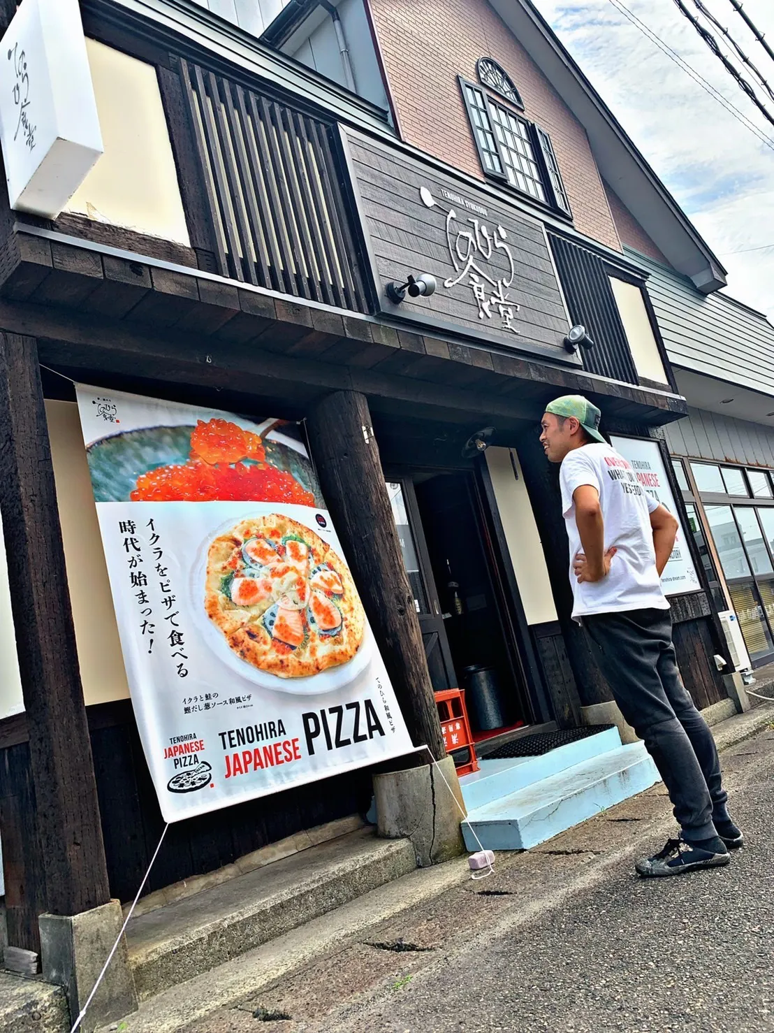 さて、先日クラウドファンディング用の返礼品「イクラと鮭の 鰹だし葱ソース和風ピザ」の特大タペストリーが届きまして、早速お店に張り出しております。
