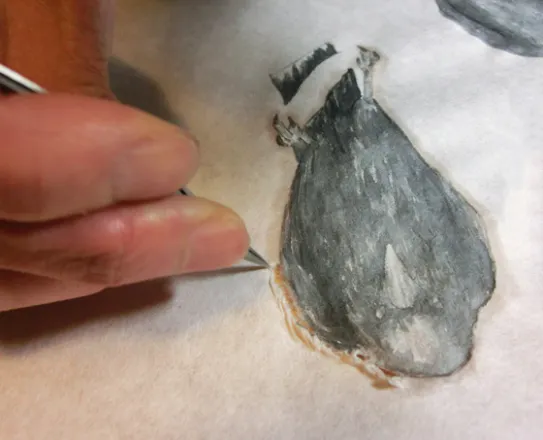 ④カラスの周囲を水で濡らし、千枚通しなどの尖ったものでつんつんしながら切り抜きます。