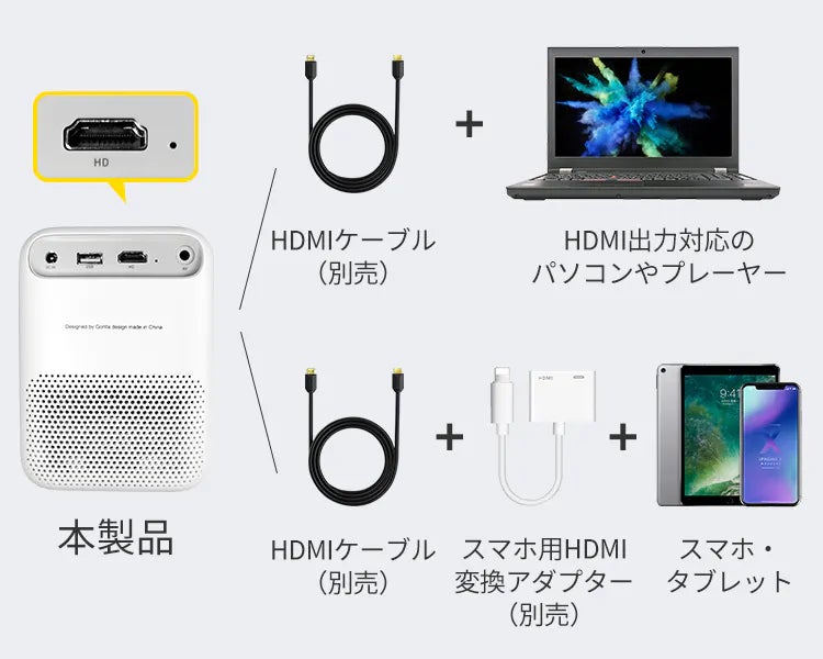 本製品はHDMI端子から映像を入力するので、その他デバイスと接続する場合はHDMI端子に変換出来るアダプタをお使いいただき接続してください。