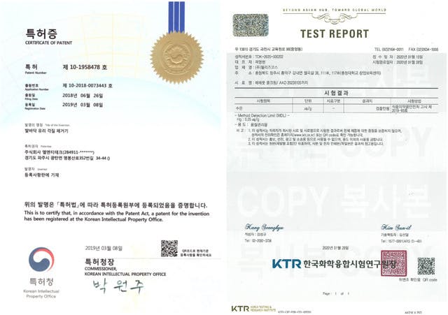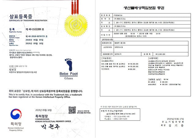 特許番号10-1958478番で特許認証を受けた製品で、ベベフット商標登録証とともに有害物質成績書、生産物責任保険証書など、技術特許および認証を受けた製品です。 また、世界4ヶ国への輸出ブランドとして、ブランド大賞選ばれた、製品力に優れたブランドです。