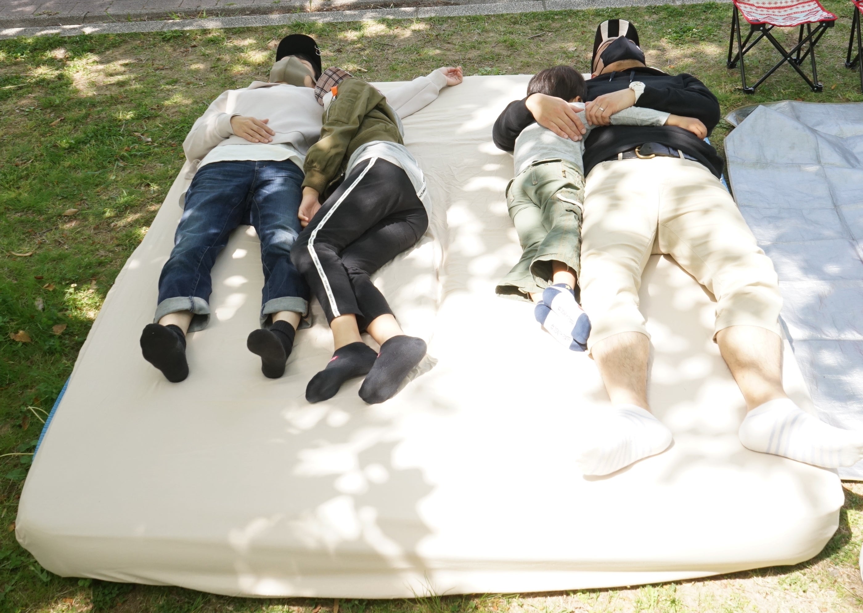 バックルを繋げば家族4人で寝ても充分な大きさのベッドになります。