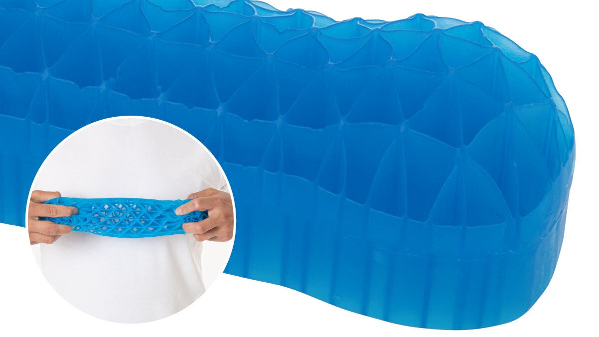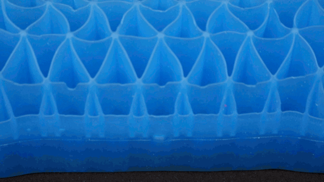 一般的な六角形のハニカム構造と呼ばれる構造とは違い、更に分割した独自の三角形メッシュ構造を採用しました。ゲル自体の密度が高くなり重たい頭部を枕の小さな面でも支えることが可能になりました。車で践んだ実験でもすぐれた復元力を証明!アウトドアに適したサイズと耐久性を実現することができました。