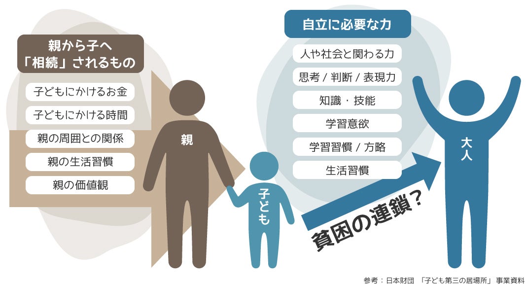 親が仕事で子どもにかける時間を取れない、親自身の生活習慣が乱れている、子どもへの関心が低い、などのような、親から子への「負の社会的相続」が、貧困の世代間連鎖につながっていると言われています。