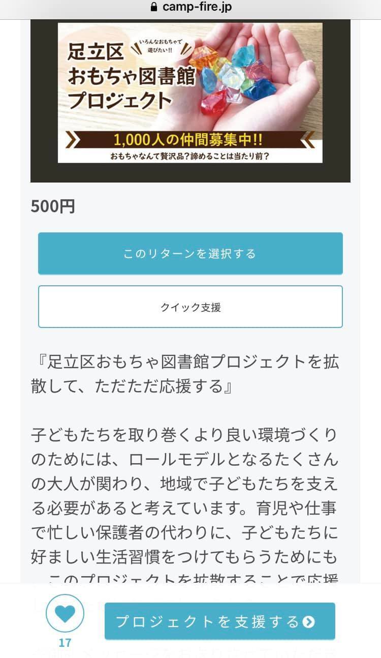 現在挑戦中の足立区おもちゃ図書館は、普段の生活ではなかなか出会えない「おもちゃ」や「絵本」を通じて体験機会を提供し、地域とのかかわりあいの機会を増やすことで、 子どもたちが基本的な生活習慣を身につけられるようにサポートするプロジェクトです。子どもを取り巻くより良い環境づくりのためには、ロールモデルとなるたくさんの大人が関わり、地域で子どもたちを支える必要があることをあらためてお伝えさせてください。そこで、昨日、子どもたちを支える1000人の大人の方に、サポーター(仲間)になっていただきやすいように500円のリターンを追加させていただきました!現時点(11/29 19:00)で、99名の方からご支援いただいているため、あと901名の仲間を募集しています!お知り合いの方への再シェアのご協力、どうぞよろしくお願いいたします。p.s.昨日、「良い映画を観る会 足立」代表の やこう えみさんにお声がけいただき、映画「こども食堂にて」の上映会で、クラウドファンディングの告知をさせていただきました。