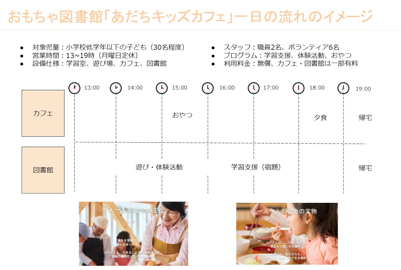 ・内容:「子ども第三の居場所」をつくり、子ども達一人一人に担当職員を充て、1 対 1 の関係を重視しながら、できるだけ家庭に近い精神環境を目指し、子どもたちの生活習慣形成や学ぶ意欲向上を支援する