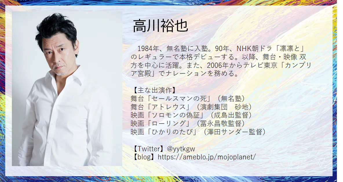 「僕は監督もやっているので構想の段階から話を聞いていたのですが、何翁さんの、メッセージを伝えたい、という気持ちがしっかりと現れた、良い作品になってきていると思います。そういった良い脚本に飲み込まれないように、俳優としても、監督としても、出来る事を精一杯やっていきます。」