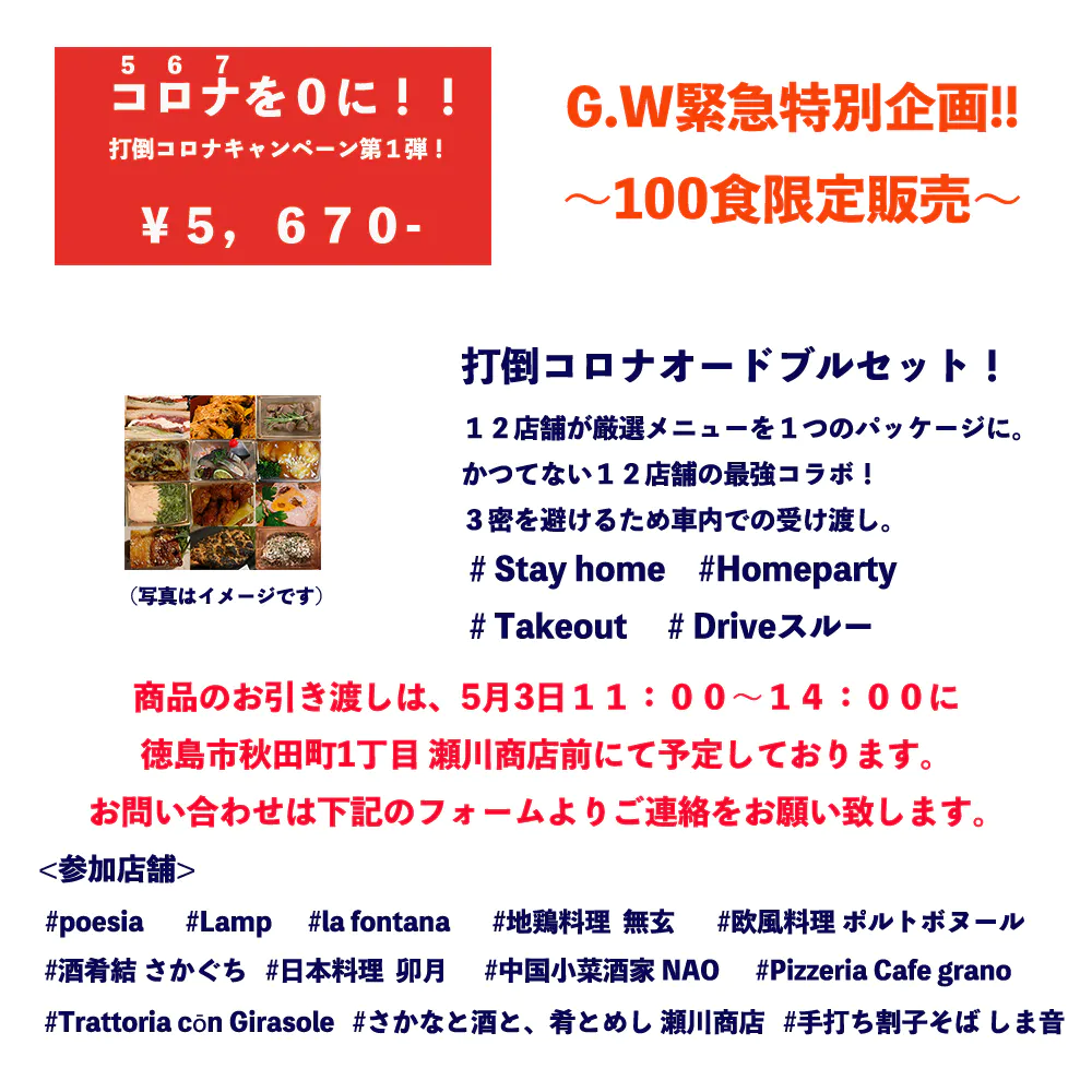 また、ゴールデンウィークの5月3日、打倒コロナ!オードブルセットを5670円で販売。SNSで募集したところ即日150食を完売しました。