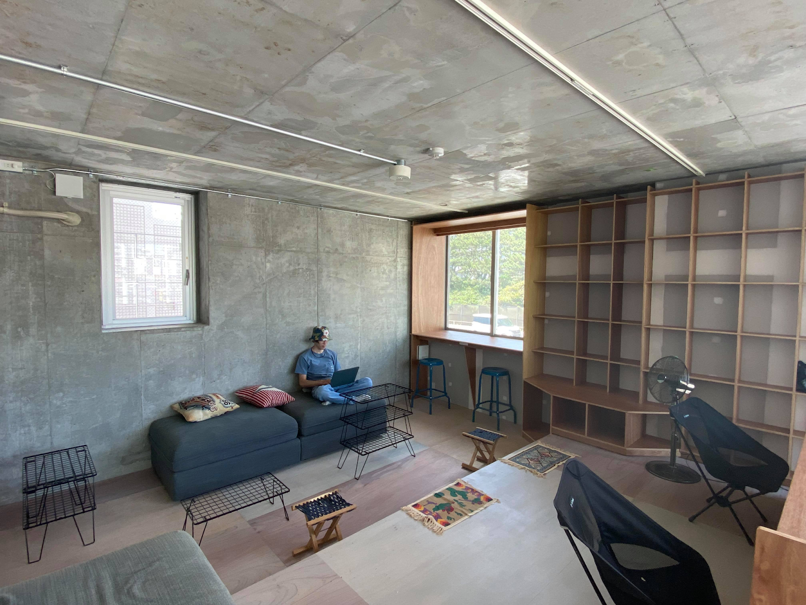 2階は、コワーキングではありますが、オフィスのようにカチッと働くスタイルではなく、靴を脱いでくつろげる、居心地の良いスペースです。ソファに座ったり、寝転がったり、自由な姿勢でのんびりと働ける空間を目指しています。