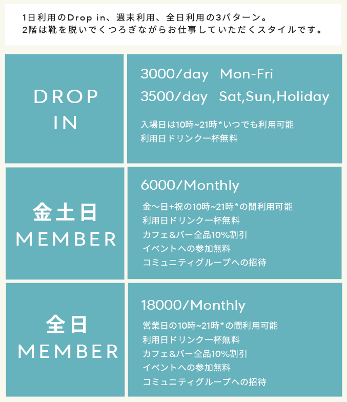 「まずはお試しで一日だけ使ってみたい」という方に向けて、DROP IN利用も可能です。是非まずは,COMMAにお越しください!