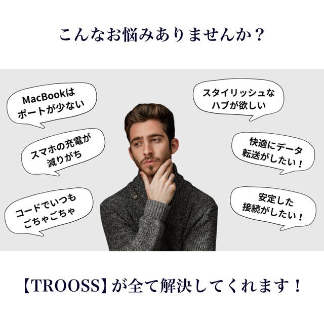 スタイリッシュなMacBookをもっと機能的に使えて、かつ世界観を壊さないTROOSSハブに魅了され、今回machi-yaにてご紹介をさせて頂くことになりました。