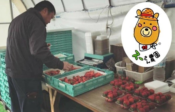 ▲厳選した苺を丁寧にパッキングするスーさん 苺が大きい!!ロゴもかわいい!!