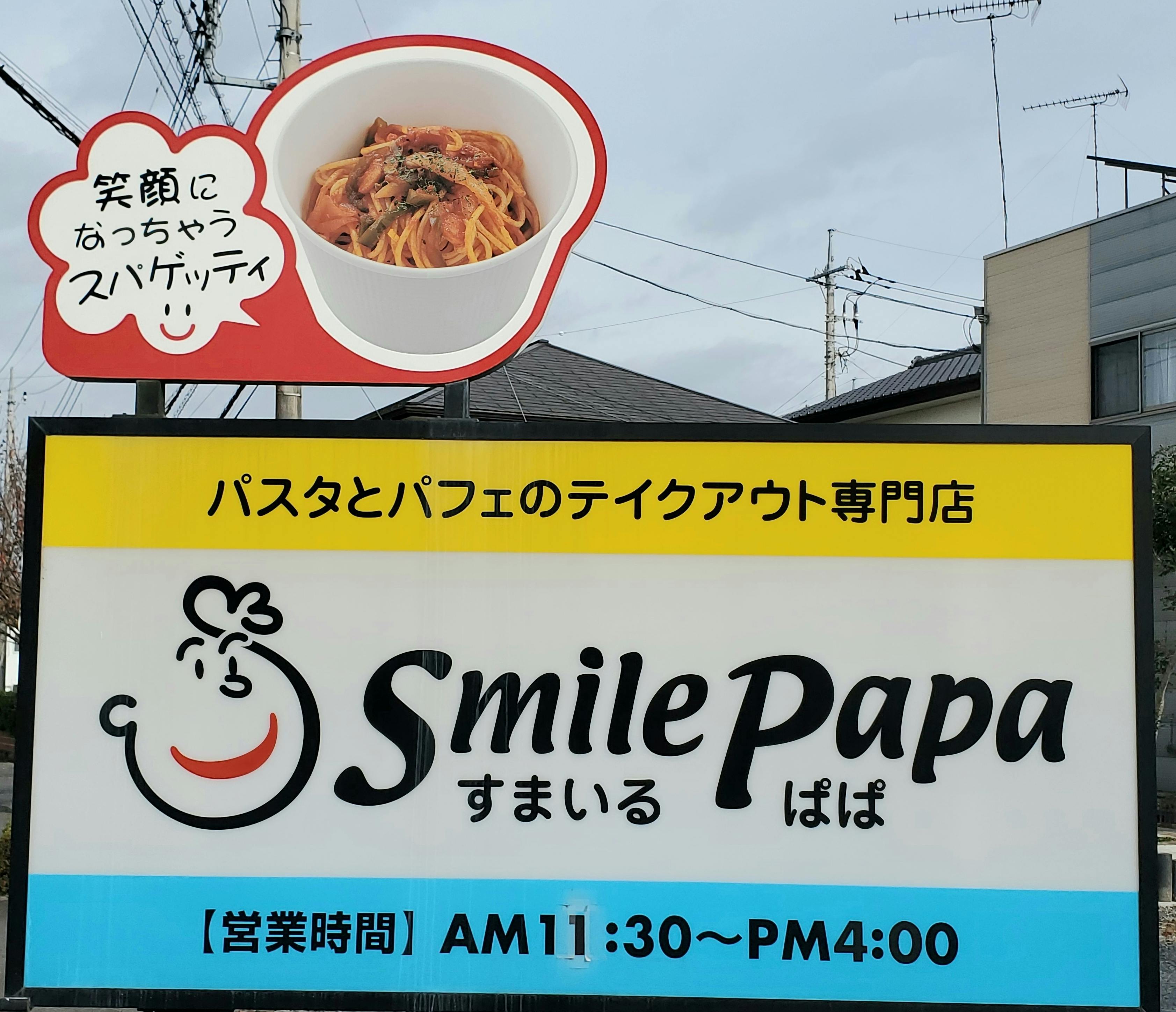 今朝、看板の『笑顔になっちゃうスパゲッティ』の文字を見て、すまいるぱぱの店名にかけた思いを、あらためて心に刻みました。皆様に笑顔になってもらえるような店でありつづけるため、自分たちも笑顔で努力していきます。