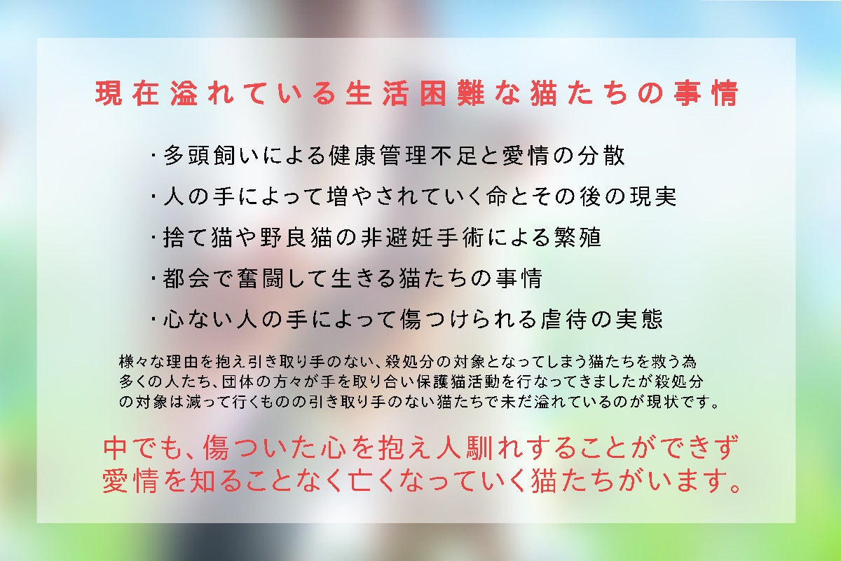 その為に1匹でも多くの猫を救うため保護スペースの拡大、専門知識を取得した上でのケア、保護する猫たちの健康維持費(避妊、ワクチン等)が必要となるためできる範囲で構いませんので少しでもたくさんの方々に賛同頂けると嬉しいです。