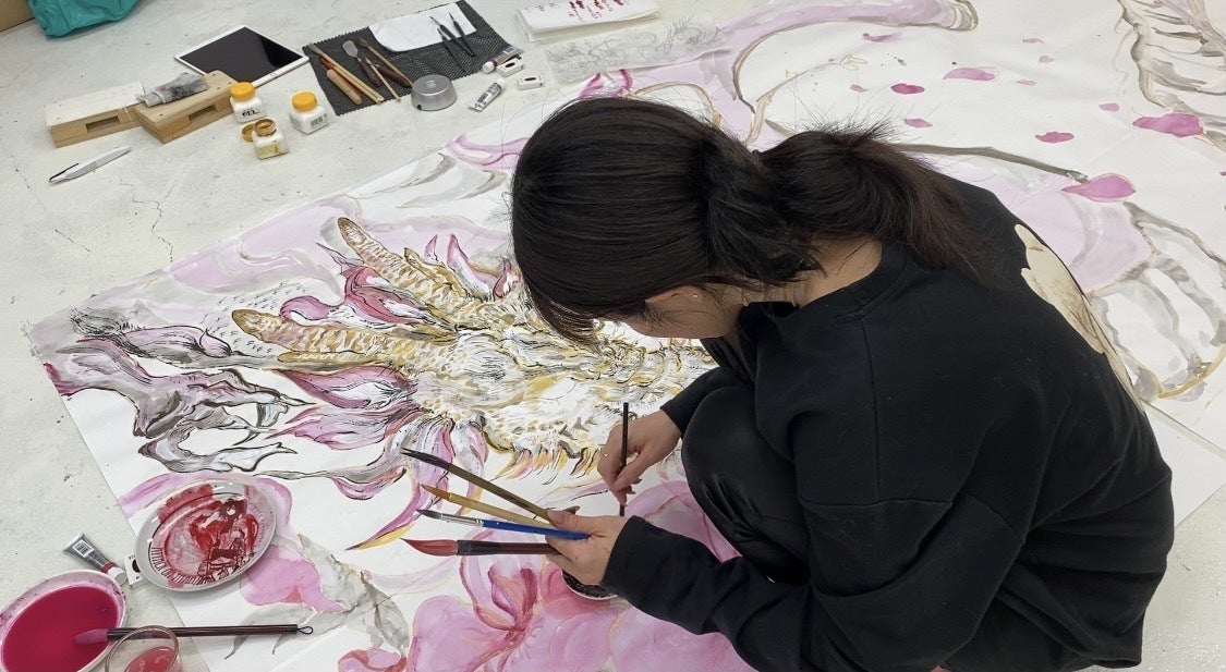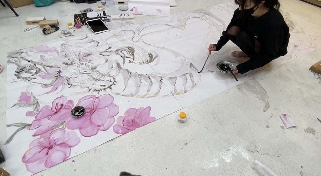 墨のみで描く水墨画から、顔彩を使用し屏風や壁画などの大型作品を得意とし、日本画ジャンルで動植物・精霊・龍神を描いています。