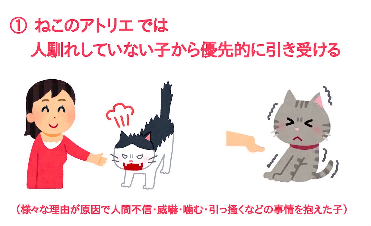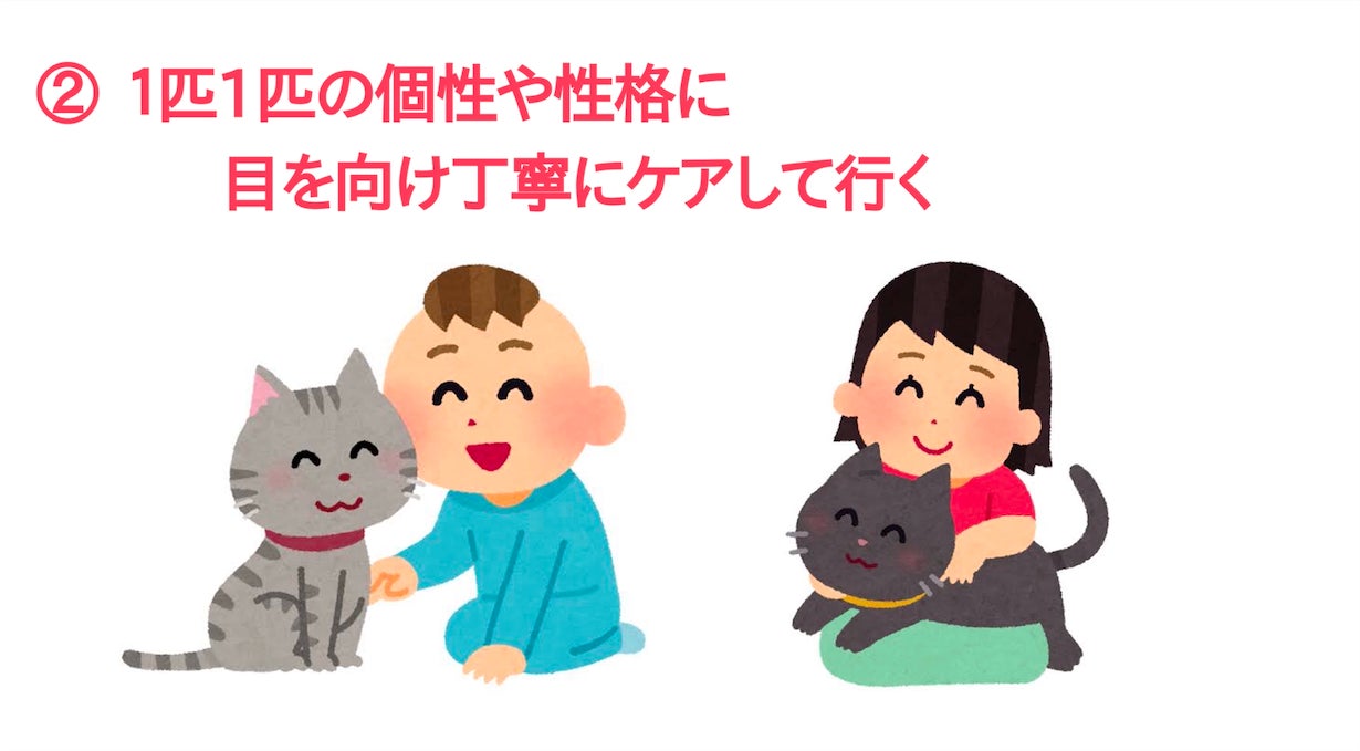 目的を絞り、どんな子でも平等に幸せになれる家族と出会い温もりを知ってもらうため、保護・譲渡だけではなく資格を持って猫のケア、暮らしに欠かせない人(飼い主)の飼育マナー向上を促し継続して施設運営をしていきたいと考えています。