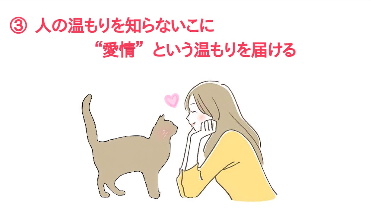 人と猫が心を通わせ、触れ合うことで人へ齎らす癒しの時間、猫との幸せな暮らしをもっとたくさんの人たちに感じてもらいたいです。