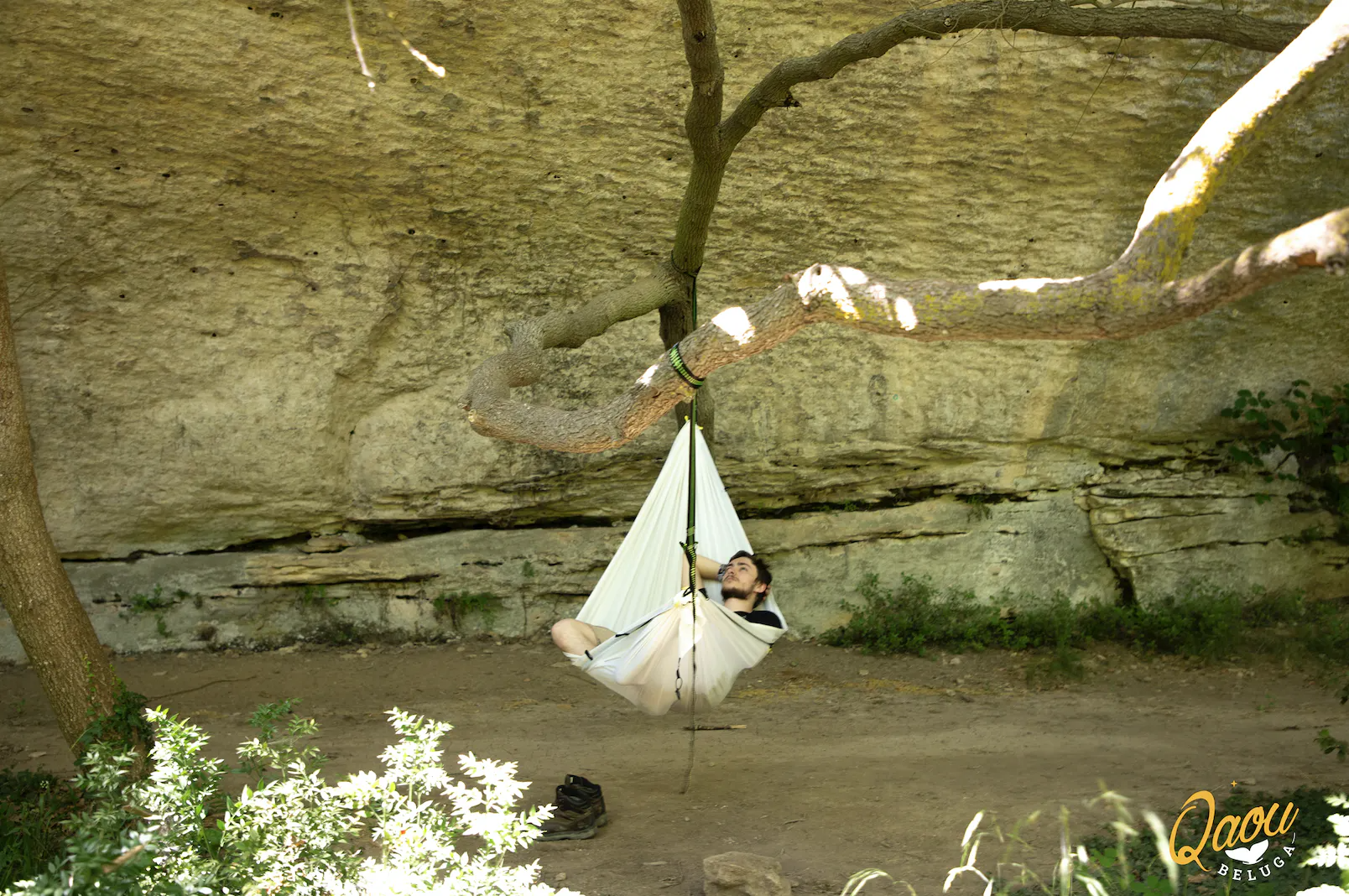仲間たちとアウトドアを楽しみに行った南フランスのオヤジさん。荷物の量を見た仲間に「テントは持ってこなかった?」と聞かれ、「ハンモックを持ってきたよ」とニコニコ自慢げに、そう答えたオヤジ。いざ、目的地に着いてみると肝心の木がない。ハンモックを吊るす木がなかった。仕方なくハンモックの生地を直接地面に敷いて寝る他ない自分への情けなさ。「どうにかならんのか?」と考え、ある日突然ヒラメキ、それをQaouというアウトドアギアの形にしたその息子たち。