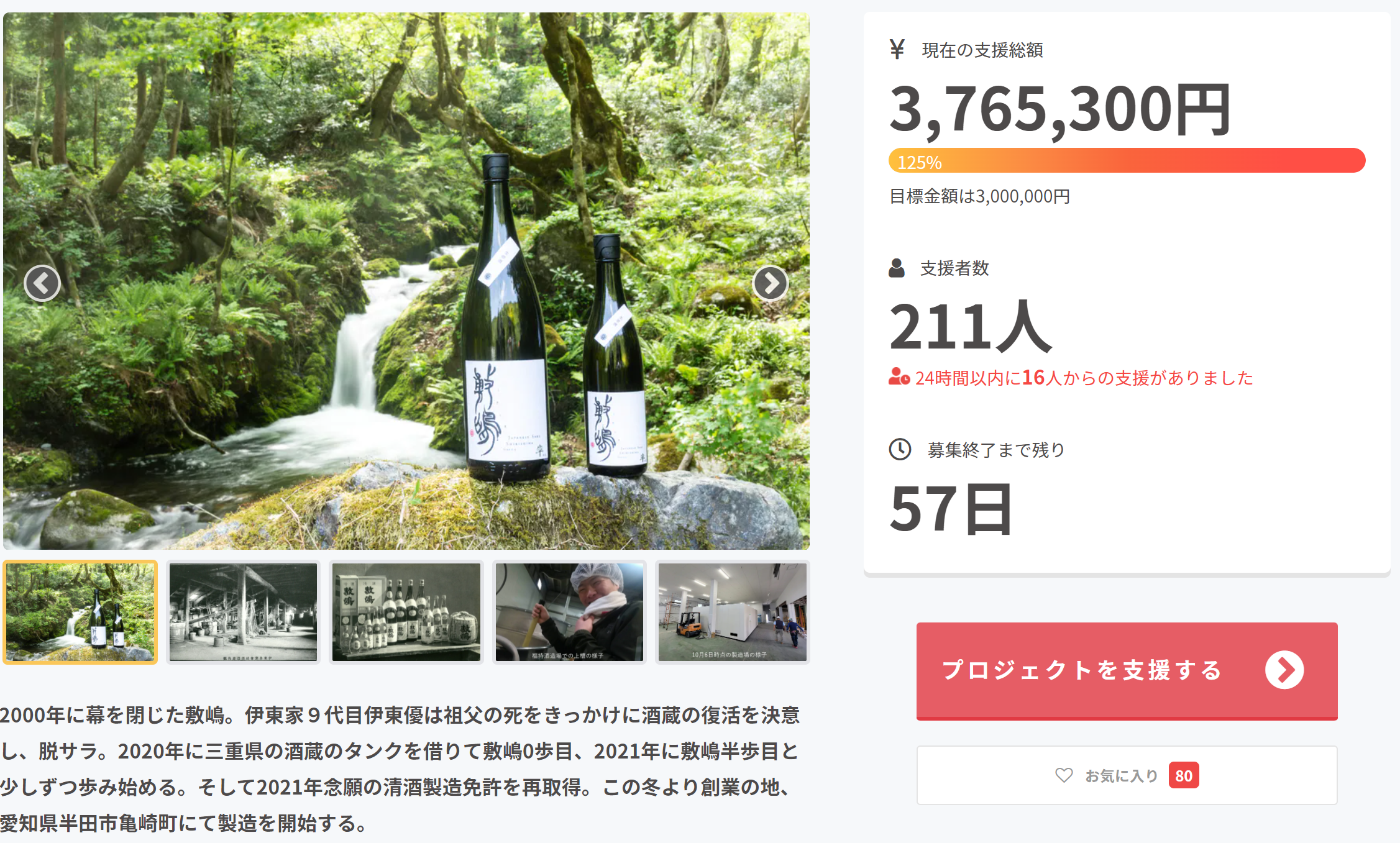 皆様、こんにちは。今回の発案者である伊東優と申します。この度はご支援を頂き、誠にありがとうございました!なんと開始1日半にて目標金額の300万円を達成することができました!!本当にありがとうございます! ※写真は10月31日 15時時点です 皆様に期待して頂いているということをひしひしと、そして併せてピリピリとプレッシャーも感じております。このプレッシャーを力に変えて、まずは酒造りができるまで各種調整および下準備をしっかり行い、滞りないスタートを切れるように頑張ります。なお、300万円という目標ですが、”最初の1歩目ができるまでの原料代(=お米代)”がこれくらいと想定されるため設定させて頂きました。勿論、今期の原料代総額からすると何分の1かに過ぎず、資金繰りとしては決して安全ということではありません。もしまだ皆様のお力添えをいただけるようでしたら引き続きご支援頂ければ幸いでございます。また明日からは製造場の現状をこちらに記載させて頂きたいと思います。それでは引き続きよろしくお願いいたします。