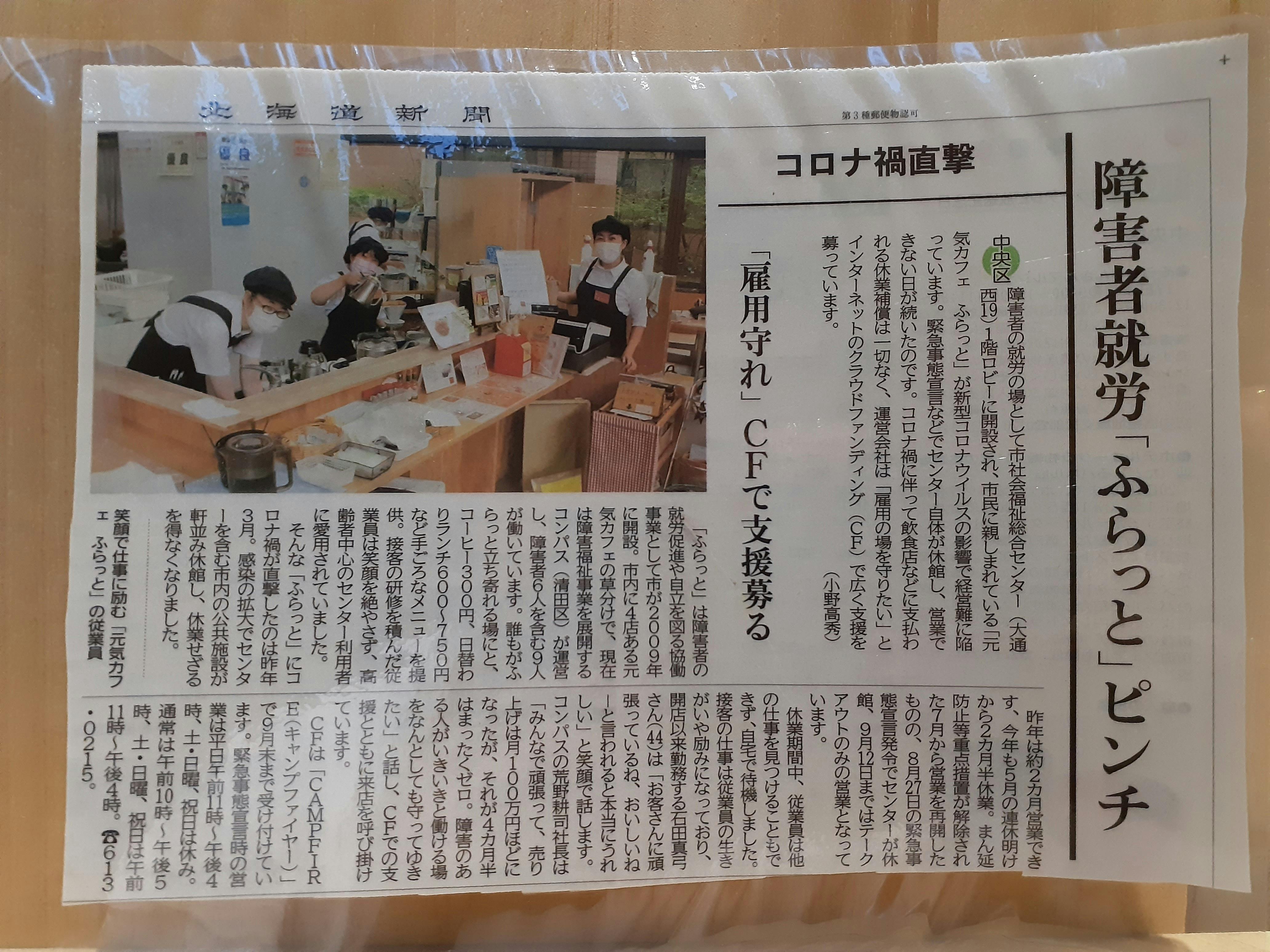 3月に最初の休業、4月に再開したと思ったら、またの休業。再開して上向いてきたと思ったら、札幌市内感染拡大のための外出自粛。この中で、私たちはどうしたらこの「元気カフェふらっと」を継続して運営していけるか検討をし、それまでのNPO法人地域生活きたのセンターぱおによる「札幌市会社協働事業」としての運営をあきらめ、以前の8割の収入でも運営を続けられるように、就労継続支援A型事業に形態を変え、関連会社の株式会社コンパスに経営を移管しました。