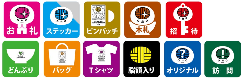 ●耐水ステッカー ●ピンバッチ ●両想い木札 ●ピーリング脳額入り・証明書付き ●秘密基地招待状・基地のアクキー ●どんぶり ●T シャツ名入れ(T シャツ、企業様コース) ●バッグ(T シャツ、企業様コース) ●超全部セット ●企業様用 ●オリジナルうどん脳(販促用/ 販売不可)