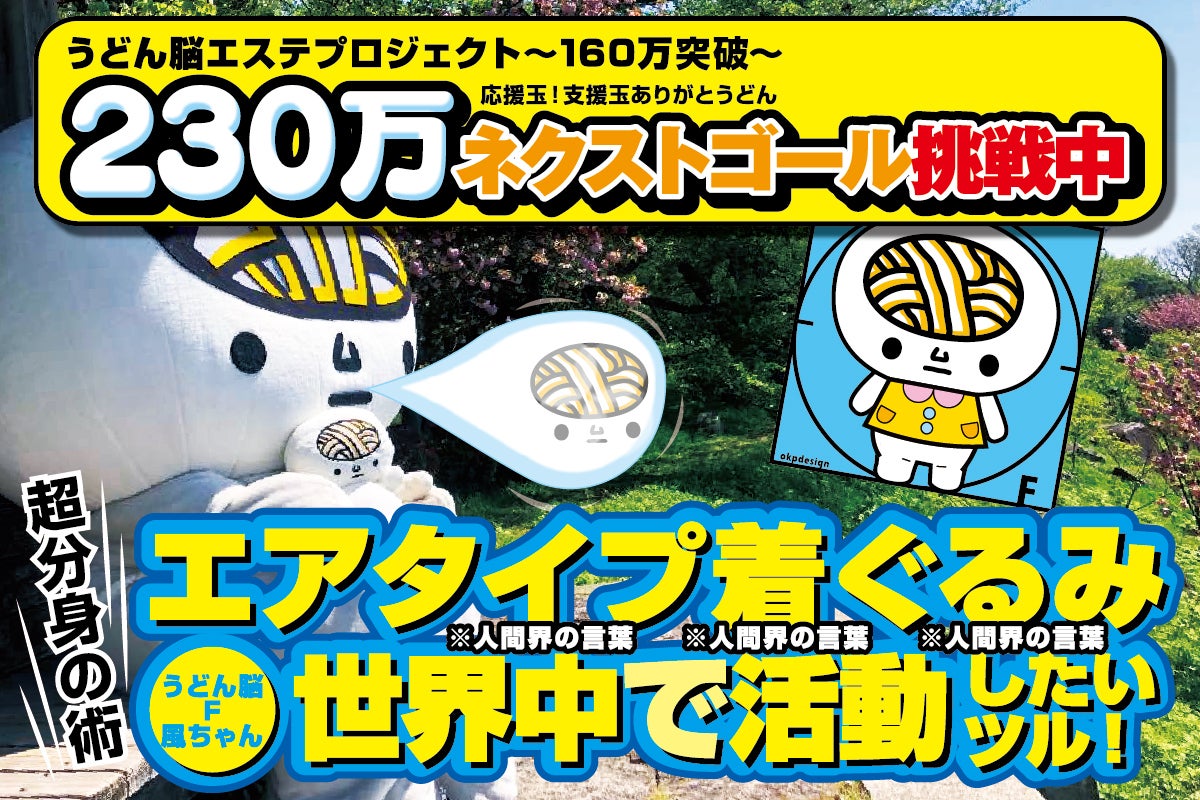 そこで、長年の夢「巨大・縮小も自由自在のエアータイプうどん脳F(風ちゃん)」を超分身!誕生させたいことをお話し、さらに温かいご支援『皆様のうどん脳夢』で、目標の130万円を達成いたしました。