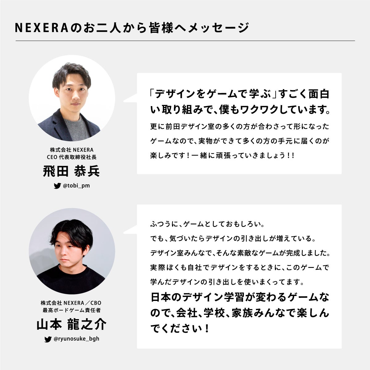 そんな「学び×ボードゲーム」を追求するNEXERAさんからCEO 飛田さん / CBO 山本さんに制作に加わっていただきました。