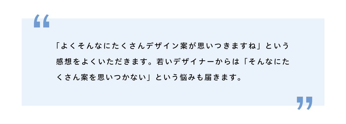 自分自身もそんな苦い経験を何度もして、それをなんとか克服するために必死になって「自分のデザインの引き出し=デザインの必殺技」を膨大に増やしたとのこと。