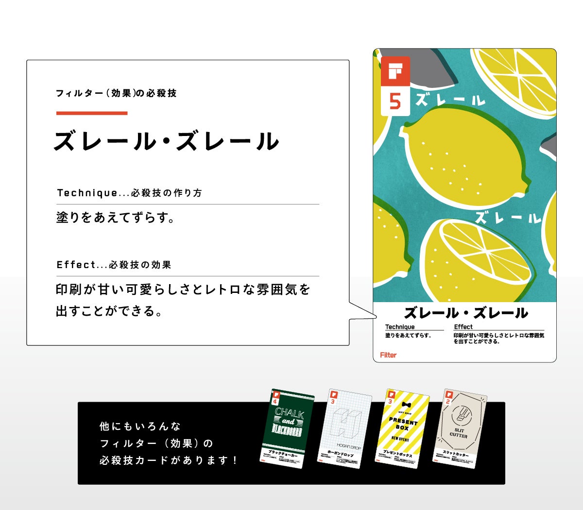必殺技は特性別に「カラー(色)」「レイアウト(構図)」「タイポグラフィー(文字)」「フィルター(世界観)」の4ジャンルに属しています。