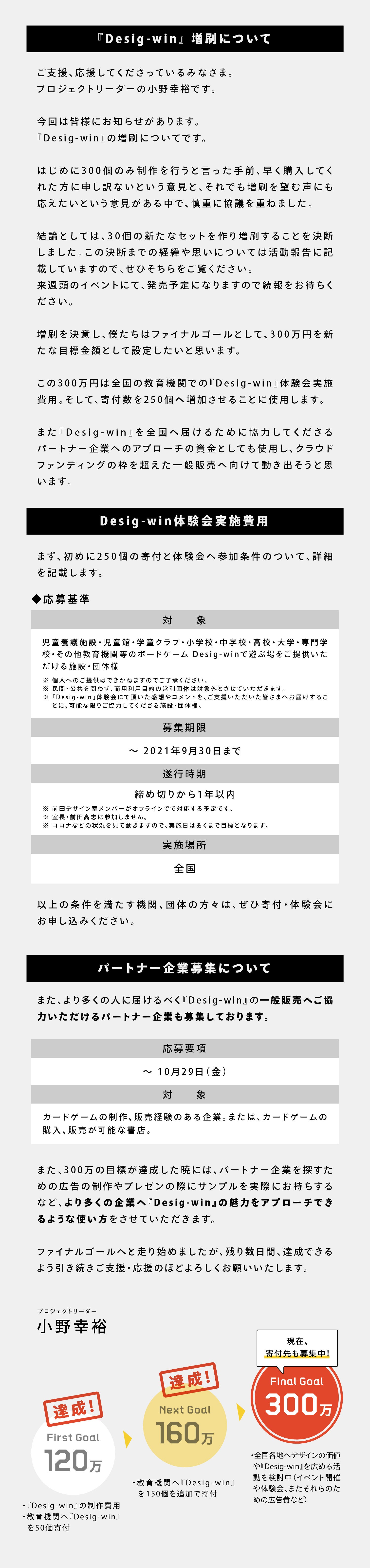 2024/02/20 13:00プロジェクトリーダーの小野幸裕です。大変ご無沙汰のご連絡失礼します。マエデ(前田デザイン室)で制作したカードゲーム『Desig-win』の残りの在庫を発売することになりました。今回はその経緯を説明させてください。まず今回のプロジェクトでは、ご支援いただいた金額でDesig-winを増刷し、教育現場へ寄付をするというゴールを設けていました。そして、みなさまの応援のおかげで、目標金額を達成し、無事に寄付分のDesig-winを制作することができました。クラウドファンディング終了後には、寄付を希望する学校を募集し、合計20校(73個のDesig-win)の寄付を行いました。こちらもご応募いただきありがとうございます。その後の活用情報に関してはまた後日お伺いする予定です。無事に寄付分もお送りすることができたのですが、結果、想定よりも少ない応募数となってしまい在庫が余る状態になってしまいました。これは我々の広報活動が至らなかったことも理由の一つとしてあります。せっかく応援してくださったにも関わらず大変申し訳ございません。一方、このクラウドファンディングから約3年。再販の声も大きく、このまま倉庫に眠らせておくなら、楽しんでもらえる人が増えるほうがいいかもしれない。しかし、学校機関への寄付といって支援してくださった皆様への約束を破ってしまうことになる。その狭間で議論を重ねた結果、今回は再販に踏み切らせていただくことを決意しました。ただ教育現場にまで「Desig-win」をお届けしたい。その想いは変わらないので、今回の再販をすることで「Desig-win」を知っていただくこともあると思います。学校からの支援の声があればその分増刷して支援していこうとも考えています。何卒ご理解のほど、よろしくお願いいたします。改めて、Desig-winというカードゲームがこの世に誕生できたのは、皆様の応援のおかげです。本当に本当にありがとうございました。今後ともマエデをよろしくお願いいたします。 もっと見る