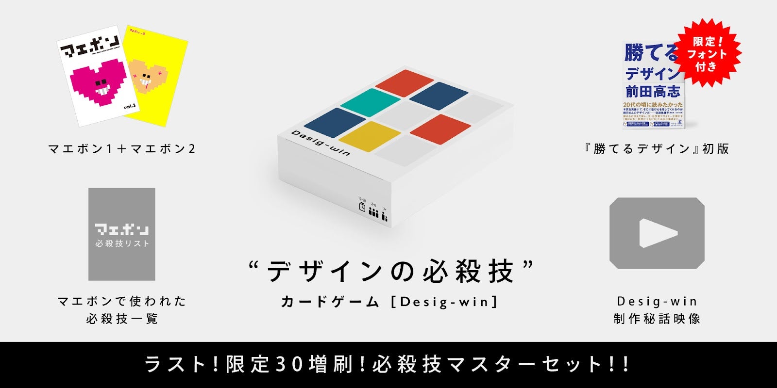『Desig-win』1セットに加え、「マエボンセット!」でも登場しました前田デザイン室が作った雑誌であるマエボン1、マエボン2、今回新たに制作したマエボンの必殺技一覧、そして『Desig-win』の元となった『勝てるデザイン』、さらに今回は “ Desig-win制作秘話 ”を合わせた、深く学べる豪華リターンセットになります。