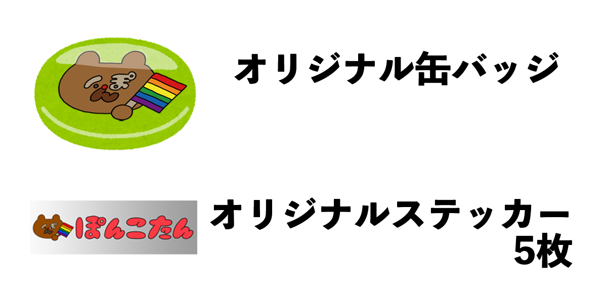 「ぽんこたん」オリジナル缶バッジ、オリジナルステッカー(5枚)のセット。