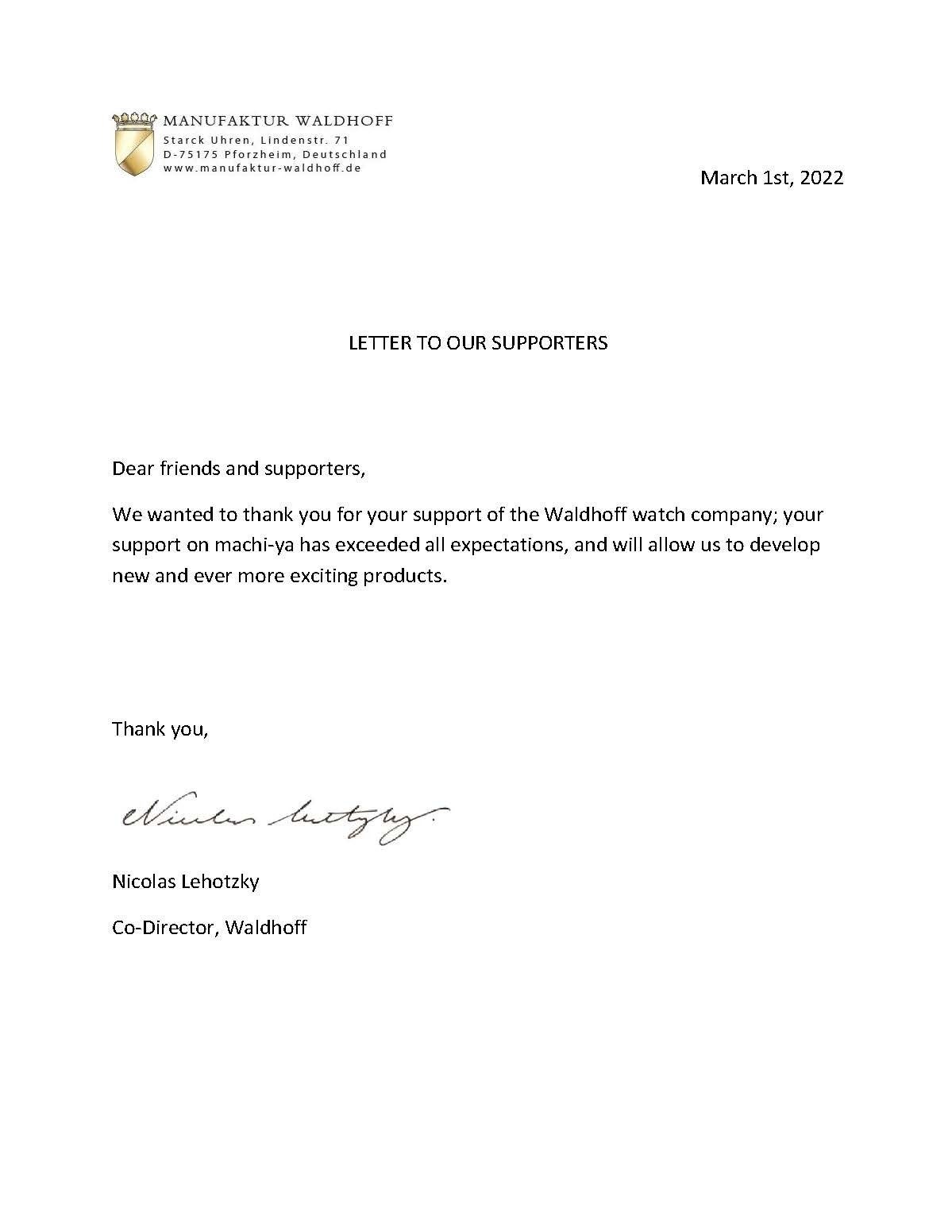 2022/03/04 16:45こんにちは、WALDHOFF運営者です。[THE IMPERIAL&THE VANGUARD V8]ですが、皆さまのご支援のもと、順調に製造が進行し、商品がドイツを無事出発したとのことです。この状況ですと3月中には皆さまのお手元に商品をお届け出来るかと存じます。そして、本日は[WALDHOFF]ブランドオーナーNickさんより支援者の皆さまにメッセージが届きましたので、ご紹介させていただきます。「親愛なる友人、そして支援してくださった皆さまへ」Waldhoff の腕時計をご支援いただき、誠にありがとうございます。皆様のmachi-yaでのご支援は期待を大きく上回り、Waldhoffとしてはこれまで以上にエキサイティングな新製品を開発することができます。心からお礼申し上げます!Nicolas LehotzkyCo-Director, Waldhoff以上となります。これからも商品の日本到着、皆さまへのお届け予定について、ご報告してまいりますので、引き続き、[WALDHOFF]を宜しくお願い申し上げます。 もっと見る