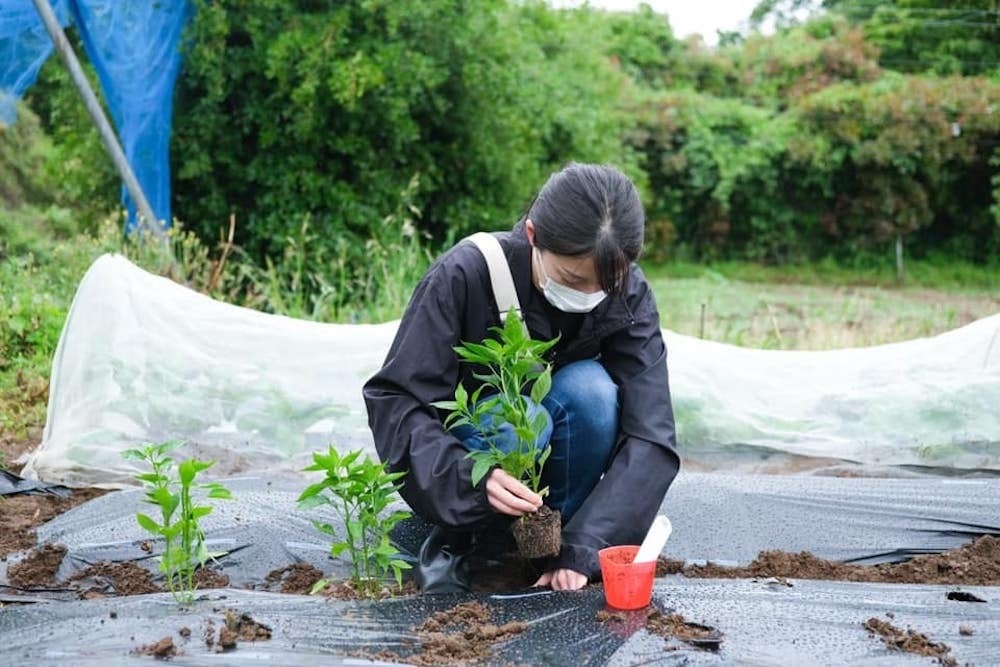 八味の原料となる唐辛子の植え付けをお手伝い