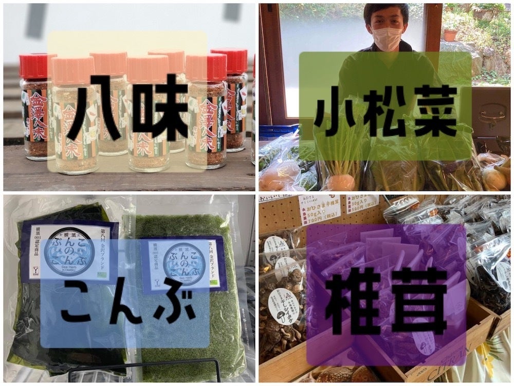詰め合わせは、先にご紹介したこんぶクッキーと海苔パスタに加え、「金澤八味」と、旭区産・季節のお野菜(ナス ・小松菜 ・オクラ)をセットにしています。