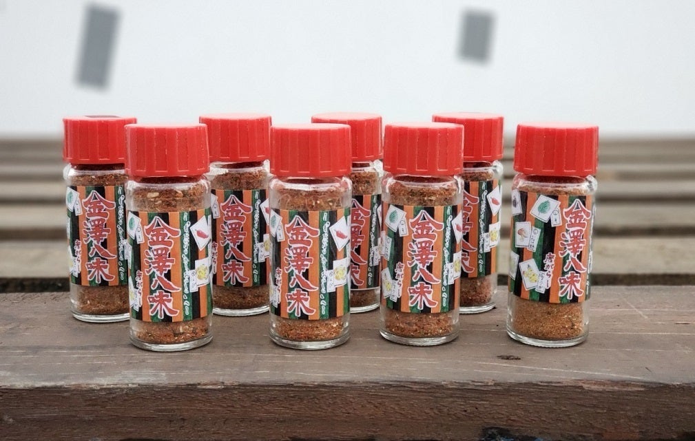 横浜市金沢区で獲れる唐辛子、シソ、こんぶ、椎茸、みかんの皮を乾燥させて作った陳皮が配合されたブランド八味。