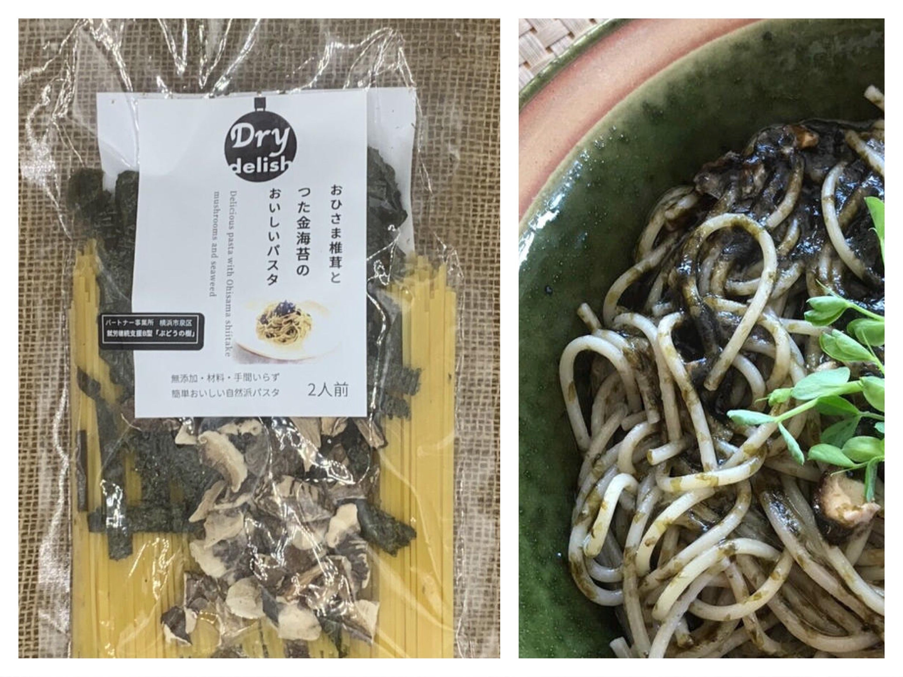 永島農園の「おひさま干し椎茸」と、出川哲朗さんのご実家の老舗海苔屋「つた金」さんの海苔が入った和風パスタ(2人前)です。