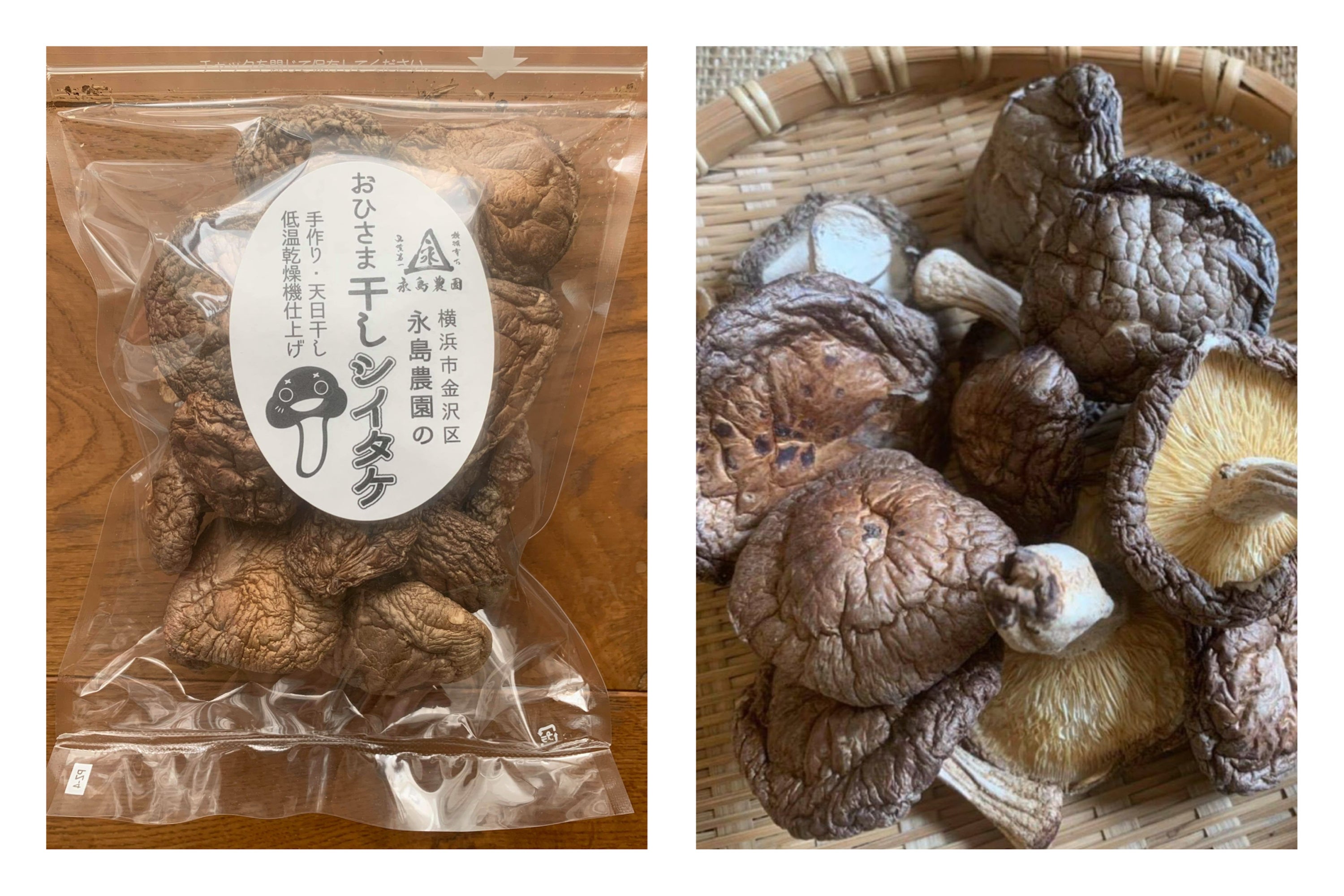永島農園は、横浜市金沢区で500年以上農業を続けており、その時代やニーズに合った農作物や花卉、養豚、養鶏など、様々なことに挑戦してきました。 2012年より、木漏れ日のような環境の中、味の濃い菌種にこだわった「おひさま椎茸」の栽培を始め、一部は天日干しした後、農園内の乾燥機で自分たちで乾燥しています。