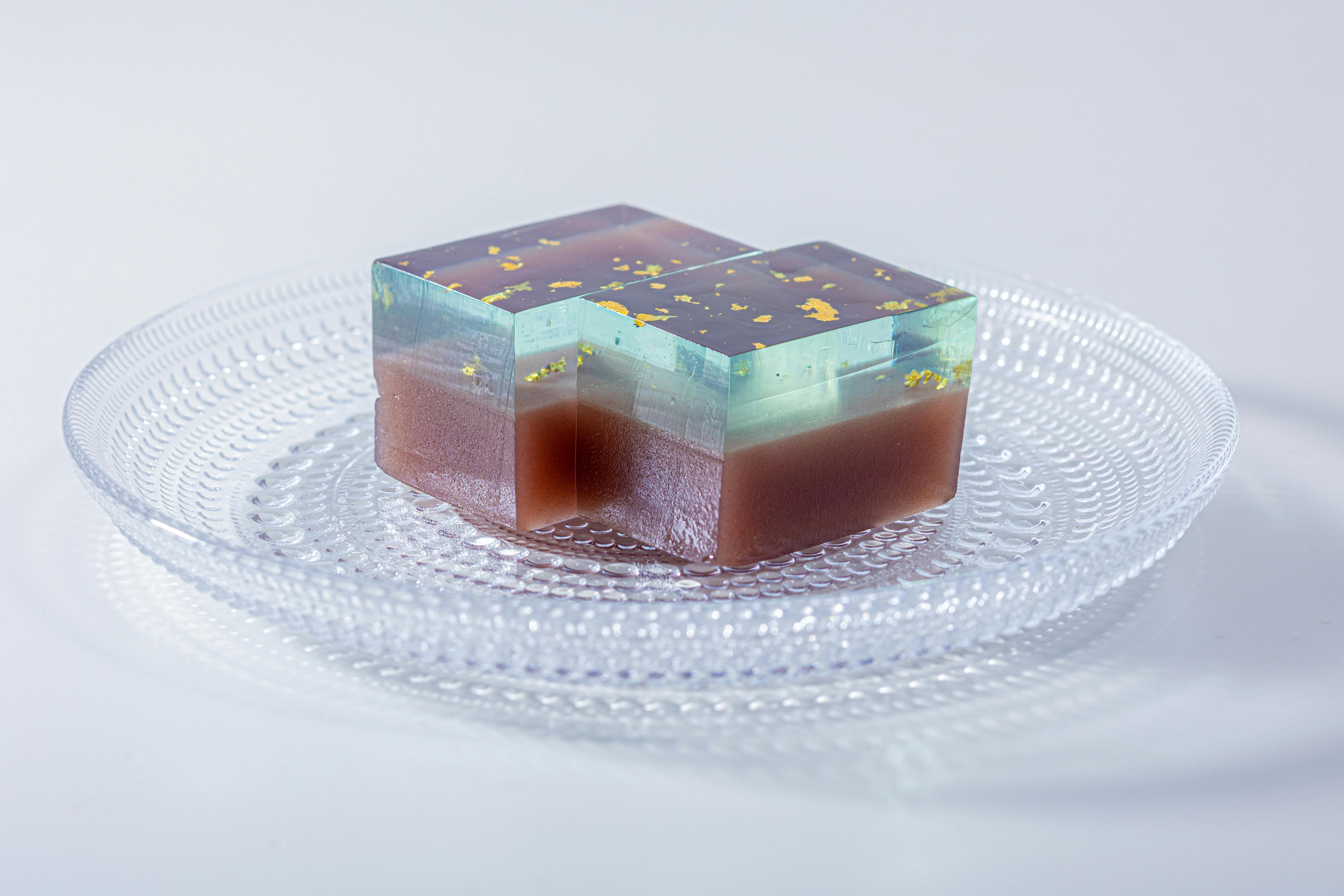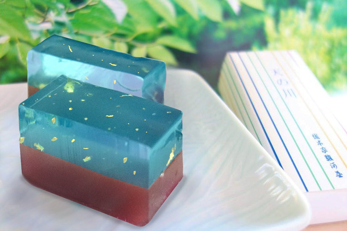 上部はプルンとした触感の砂糖入り寒天、下部は水羊羹でも羊羹でもない絶妙な硬さで固めた特製羊羹 。見た目だけでなく味にもこだわった一品です。