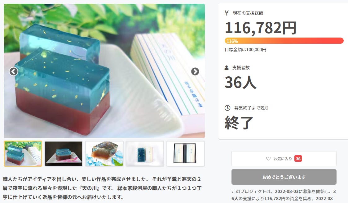 2022/08/29 10:45総本家駿河屋をご支援いただいております皆様、いつもありがとうございます。本プロジェクトは【8/28】をもちまして無事終了させていただきました。皆様お一人お一人のおかげで、目標金額を上回る【\116,782】ものご支援いただきました。従業員一同心より御礼申し上げます。誠にありがとうございました!不安ながら始めた挑戦でしたが「届くのが楽しみです!」「とてもきれいな羊羹!」など、皆様が商品の発送を心待ちにしてくださっているお声を頂戴し、従業員一同、和菓子作りに従事していることに誇りを感じさせていただきました!これからも和歌山の地で、美味しい・お客様の笑顔を届けられる和菓子作りに努めてまいりますので、今後とも「総本家駿河屋」へのご支援賜りますようよろしくお願い申し上げます!!たくさんのご支援ありがとうございました。皆様のもとへ「天の川羊羹」お届けさせていただきます、もうしばしお待ちくださいませ♪「夜空に煌めく星々のように…職人の手流しの二層仕立て羊羹『天の川』を知ってほしい」プロジェクトスタッフ一同 もっと見る