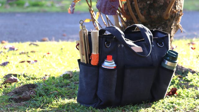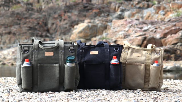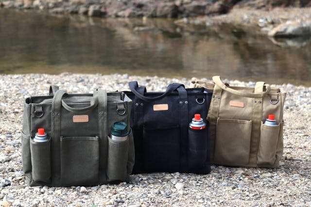 バッグ専門店ならではの技術とアイデアを生かしつつ、実際に使いやすいよう細かい調査を行いながら何度も修正を繰り返し、ソロキャンで使いやすい「7つのポケットに囲まれた帆布ギアトートバッグ」が完成しました。