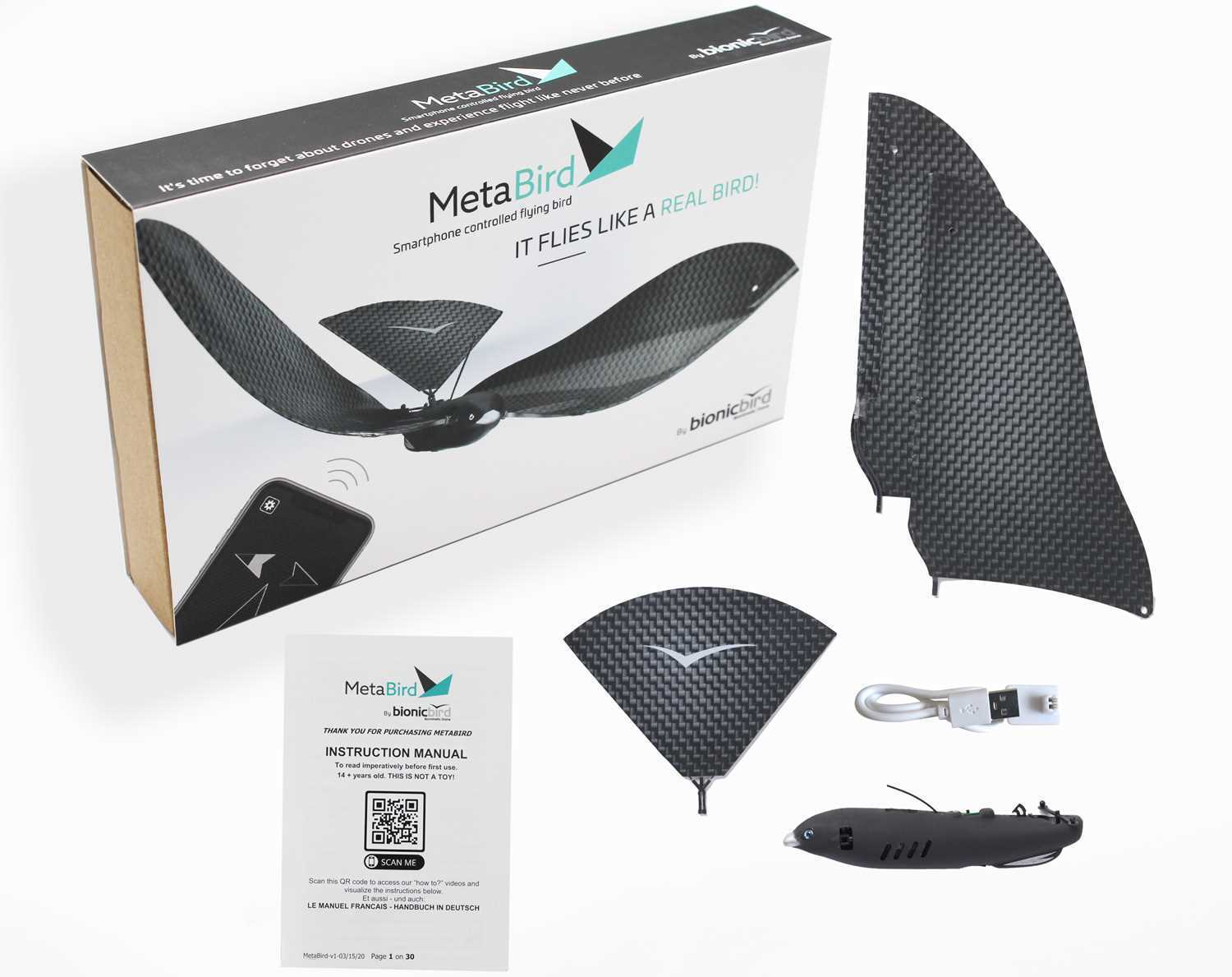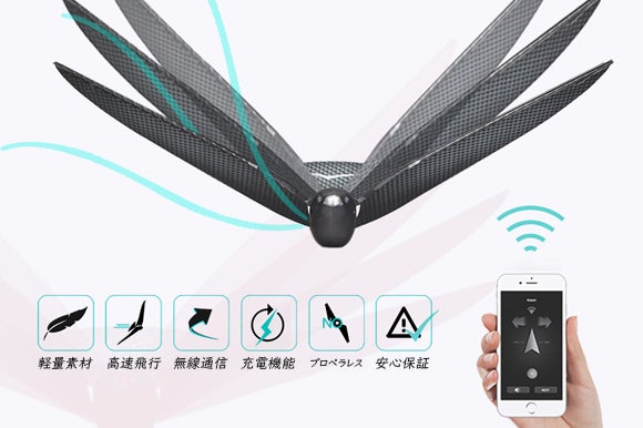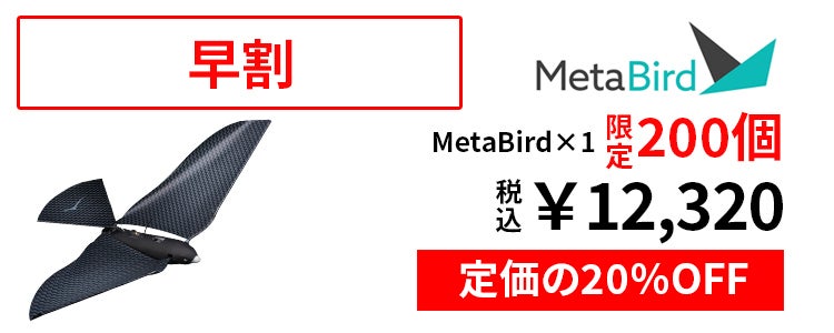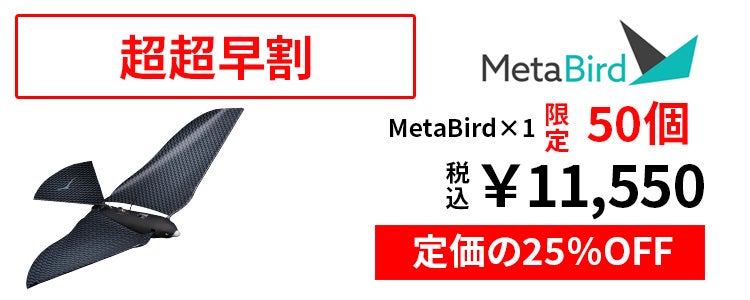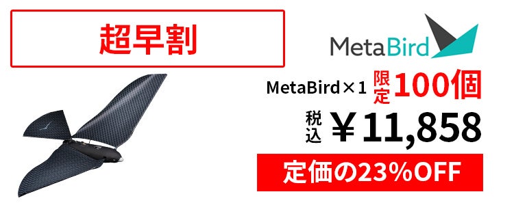 「MetaBird-メタバード-」とはスマホで操作することの出来る鳥型ドローンです。自然の生物の機能を模したバイオミティクス(生物模倣)と呼ばれる考え方に基づき開発され、柔軟性のあるプラスチックを使った本体はたった9.5g=100円玉たった2枚分しかありません。約150m範囲で通信可能でアルミラジエーターを備えたメインモーターは、機械的なノイズがほとんど聞こえず飛んでいる姿は本物の鳥と全く同じように見えます。