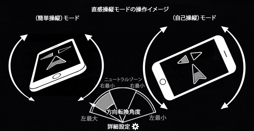 操作方法も様々あり【直感操縦モード】に「簡単操縦モード」と「自己操縦モード」の2種類があります。スマホを傾けることによって方向転換ができ直感的に操作が可能です。