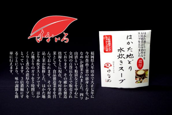 福岡県大牟田市で、大正7年から創業され現在の今村食品工業株式会社様まで、その技術は受け継がれております。確かな製造技術は、現代の物作りにも生かされており、様々な食品を生み出されております。この「はかた地どり水炊きスープ」は、はかた地どりのガラを5時間煮込み濃厚なスープをとっています。なので、コラーゲンたっぷりなトロッとした絶品なスープです。また、3倍濃縮になっているため、途中で味が薄くなっても、追い足しするだけで味の調整が可能です。