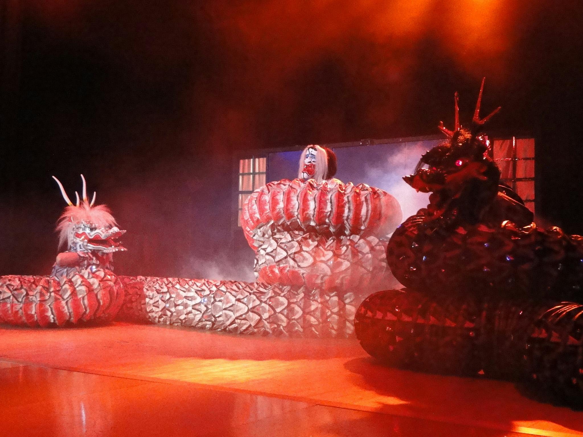 2021/11/17 14:56無事に10/29.30の和妻公演が終わりました。これも支援者の皆さまによる応援のおかげでございます。どうもありがとうございました。皆様のご支援が少しずつ増えていくのに従って、なんとか成功させなくては、頑張らなくては、と折れそうな心を必死に支えて当日を迎えました。何とか無事に終えられたのも皆様のおかげであり感謝しかございません。公演を振り返るべく写真等で雰囲気を味わっていただきたいと思います。1.100年前の浅草少年にリンキングリングを見せるマジシャン夕暮れ時の繁華街で迷子になってしまった少年はふとしたきっかけで謎の人物に出会います。その人はマジシャンだったのです。彼の住む洋館では少年がマジックを体感することで不安な気持ちが少しずつ緩和されていくというシーンです。少年と少女街中で出会った少女は人形でした。彼女はまるでマグリットの絵のように不可解に浮遊した状態になっていました。しかし少年によって少女は人間の心を手に入れたようです。空中浮遊する少女人形2.江戸時代江戸時代、マジックのことは手妻(てづま)と呼ばれていました。代表的な演目である「傘」と「蝶」です。傘尽くしと呼ばれ空中から傘が出現していく 紙で作った蝶が生きているかのように舞う3.安土桃山時代バテレンの妖術使いをイメージしたマジックが繰り広げられます。剣刺しイリュージョンを行いました。4.平安時代陰陽師の世界観を旧来の水芸に取りいれました。猩々(しょうじょう)という妖怪が戯れることで水をお酒として表現しております。水を操る陰陽師盃にて酒を飲む猩々(しょうじょう)5.明治の手妻明治期に活躍した松旭斎天一の十八番であったサムタイを演じました。コロナ禍のために客席からお客を上げることができず、対談コーナーでご一緒した(株)モノリスジャパンの岩井社長にお手伝いをお願いしました。6.ヤマタノオロチ古代の伝説をモチーフとした物語性のあるイリュージョンです。スサノオノミコトが恋人のクシナダ姫を助けるべく大蛇の化身と戦うというストーリーです。大蛇の化身に不安を覚える家族悪を倒すべく現れたスサノオノミコト村を襲う大蛇の化身大蛇の化身と戦うスサノオノミコト大蛇と戦うスサノオノミコト大蛇を倒し宝刀を手にするスサノオノミコトそして最後に意外なクライマックスを迎えて大団円となります。単なるマジックショーの枠にとどまらず踊りやお芝居、立ち回りなどを取り入れて新たな和のエンターテイメントを作り上げたと自負しております。とはいえ反省点がないわけではありません。まだまだこれから進化させていくべきところがございます。来年さらにグレードアップしたショーをご提供できればと考えています。どうかこれからも応援のほどよろしくお願いいたします。上口龍生 もっと見る