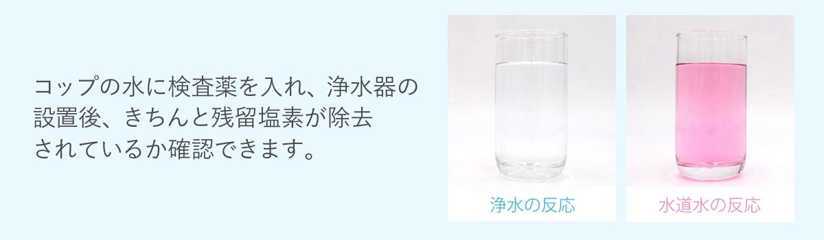 残留塩素が含まれている場合はピンク色に変化し、浄水の場合は透明のままです。