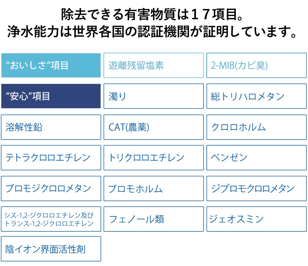 塩素以外にも、その他、水道水にわずかに含まれるといわれる17項目もの成分の除去能力を有しています。(※ただし、浄水能力140,000リットルに該当する物質は遊離残留塩素のみです。)