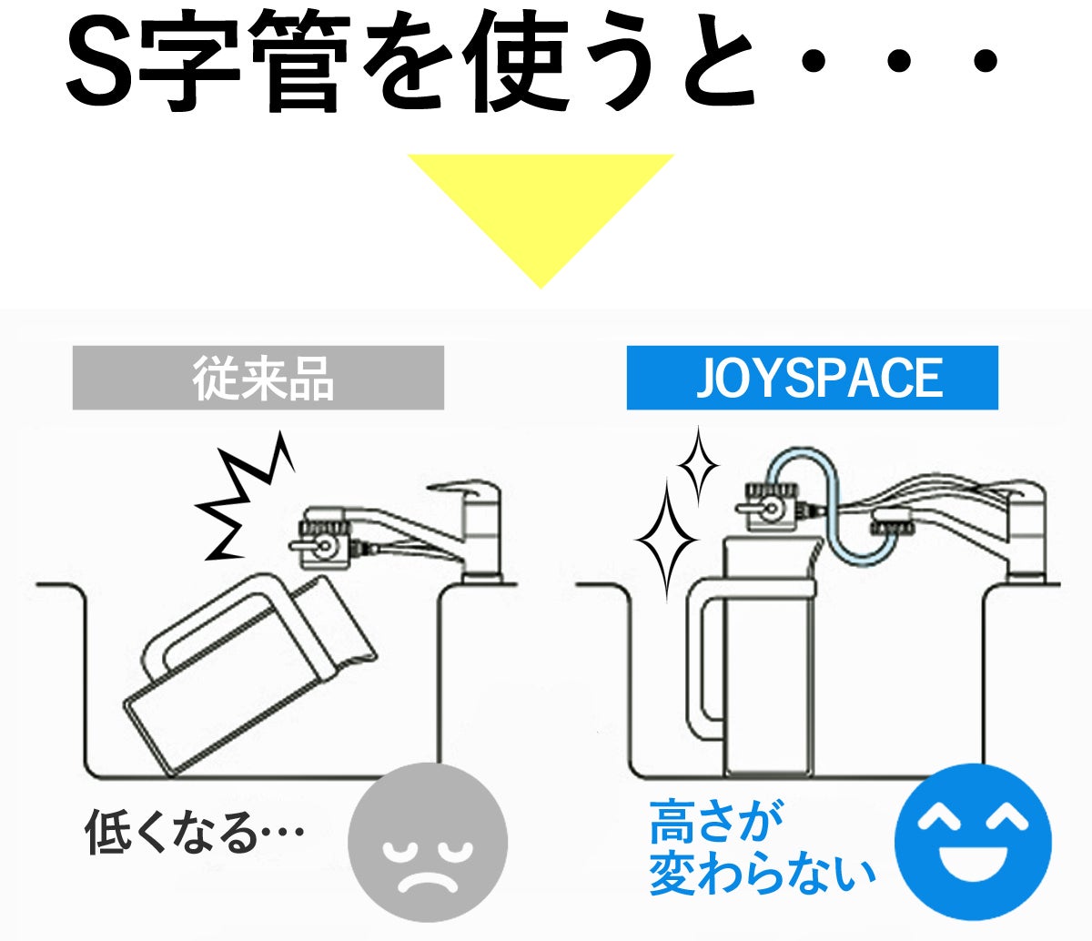 S字管を付けることにより蛇口の高さをキープ!シンクを広々とお使いいただけます。