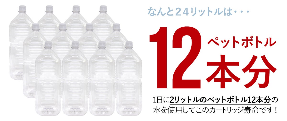 ジョイスペースの残留塩素除去能力はなんと140,000リットル!ペットボトル12本分の水の量を毎日使用しても、約12年カートリッジ交換不要です。安心してたっぷりのお水をお使いいただけます。